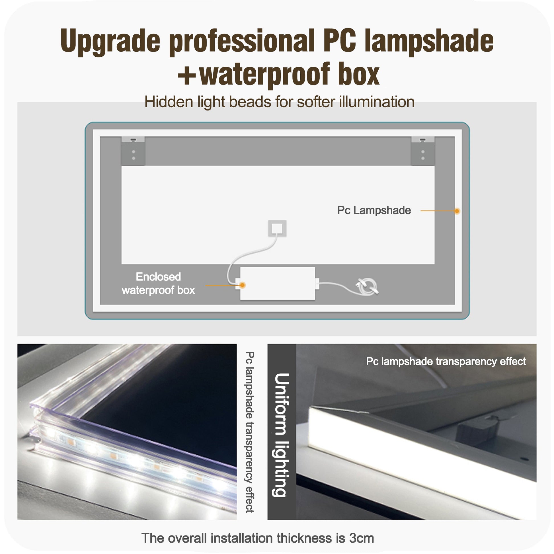 Frameless bathroom mirror with light, LED backlit mirror, tri-color dimming, anti-fog function, waterproof, smart sensor